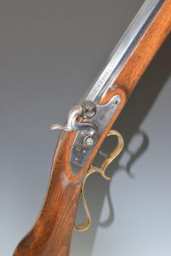 Italian .50 smooth bore percussion hammer action Kentucky style rifle with brass scrolling spurred trigger guard, storage compartment to the stock, butt plate and mounts, wooden ram-rod alignment sights and 35 inch smooth bored barrel, overall length 128cm, serial number 42999. PLEASE NOTE THAT A VALID RELEVANT FIREARMS/SHOTGUN CERTIFICATE IS REQUIRED TO HANDLE/PURCHASE THIS ITEM.
