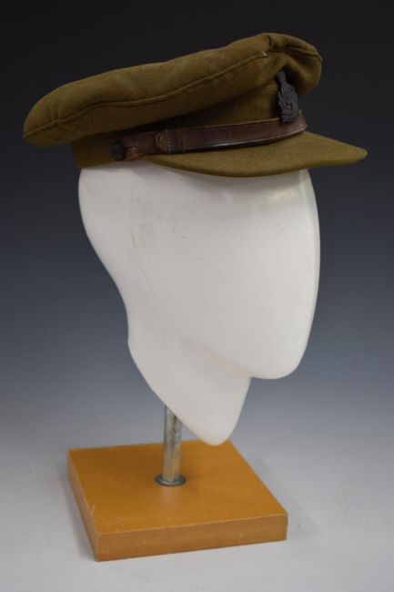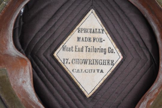 British Army khaki field service cap with Intelligence Corps badge and West End Tailoring Co, 17 Chowringhee, Calcutta supplier label to interior