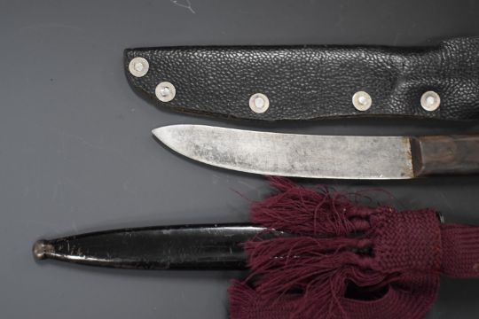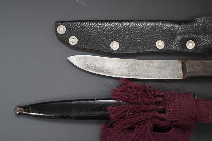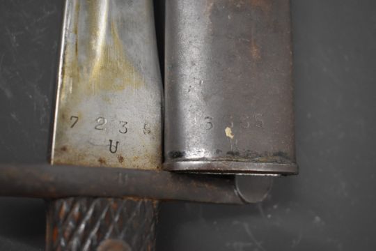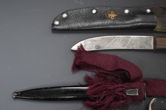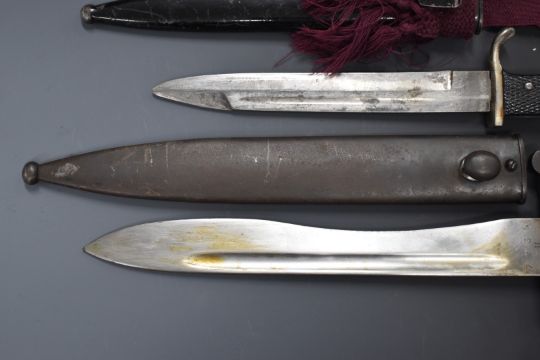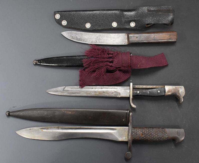 Spanish Bolo bayonet 1941 pattern with 25cm fullered blade and scabbard, German KS98 bayonet with 19cm fullered blade and a Boy Scouts knife with sheath. PLEASE NOTE ALL BLADED ITEMS ARE SUBJECT TO OVER 18 CHECK ON COLLECTION OR DELIVERY
