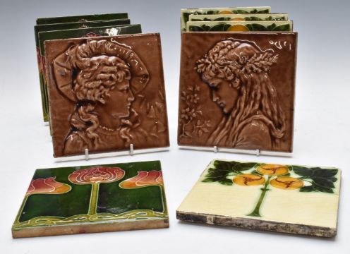 Ten 19thC / Art Nouveau tiles, most 15x15cm