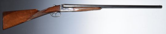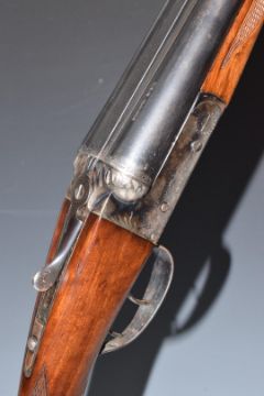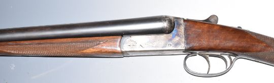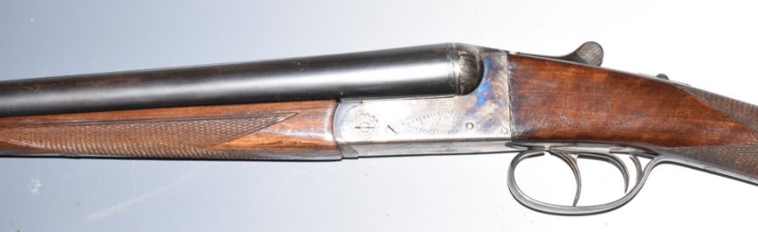 LIG 12 bore side by side shotgun with engraved locks, underside and fences, chequered grip and forend, double trigger and 27.5 inch barrels choked ½ and ¾ and engraved 'LIG Elgoibar', overall length 113.5cm, length of pull 37.5cm, serial number 81582. PLEASE NOTE THAT A VALID RELEVANT FIREARMS/SHOTGUN CERTIFICATE IS REQUIRED TO HANDLE/PURCHASE THIS ITEM.