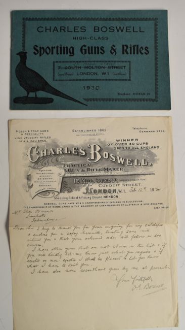Charles Boswell Practical Gun & Rifle Maker, 15 Mill Street (Adjoining Saville Row) Conduit Street, London W.1 1930 High-Class Sporting Guns & Rifles catalogue illustrated throughout and advertising shotguns, rifles, cartridges and accessories together with the original letter hand signed by O G Boswell, partner in the company, delivered with the catalogue.