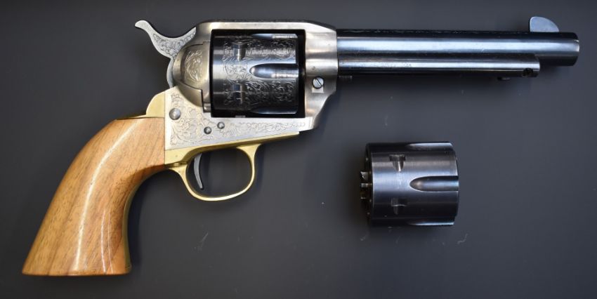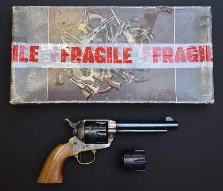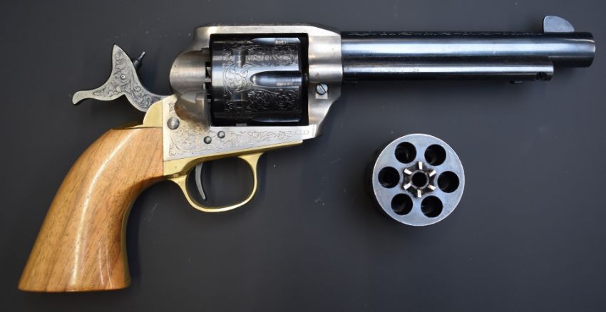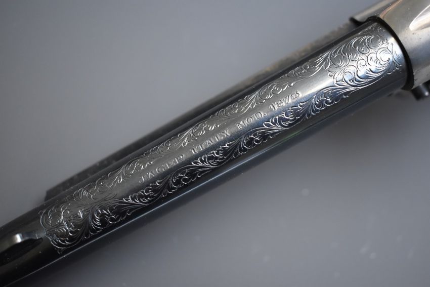 Armi Jaeger Model 1873 .44 blank firing six-shot single-action revolver with engraved frame, cylinder, hammer and 5.5inch barrel, brass trigger guard and hand strap and shaped wooden grips, overall length 30cm, serial number 6346, in original fitted box with spare unengraved cylinder.