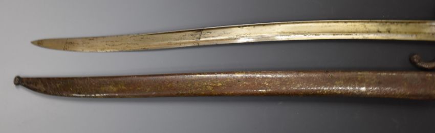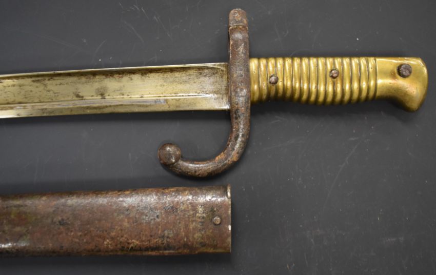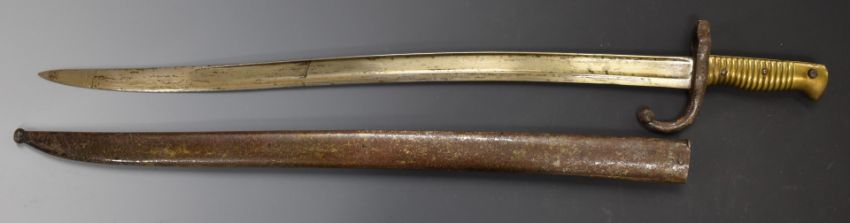 French 1866 pattern chassepot bayonet dated 1868 to 57cm fullered Yataghan blade, stamped 18488 to crossguard, with scabbard. PLEASE NOTE ALL BLADED ITEMS ARE SUBJECT TO OVER 18 CHECK ON COLLECTION OR DELIVERY