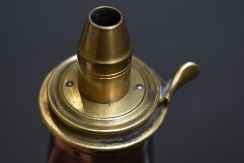 Sykes patent copper and brass powder flask, 14.5cm long.