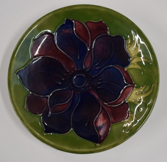 Three Moorcroft pin dishes, one decorated with birds and fruit the other in Clematis pattern