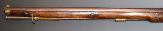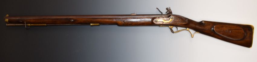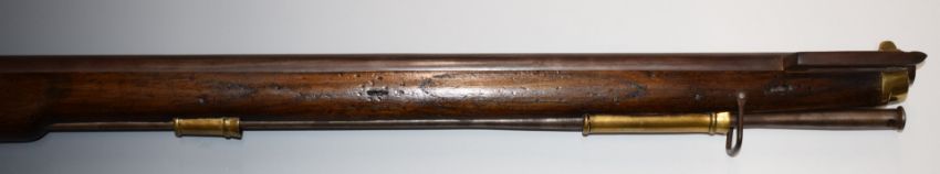 Baker pattern flintlock musket with 'Tower' and crown over 'GR' cypher stamped to the lock, line engraved lock and hammer, brass scrolling trigger guard, butt plate, mounts and storage compartment to the stock, raised cheek piece, vacant wrist cartouche, sling suspension mounts, bayonet lug, steel ram-rod, pop-up sights and 30.5 inch smooth bored barrel, overall length 119cm.
