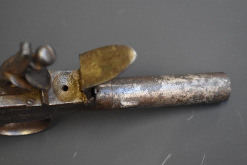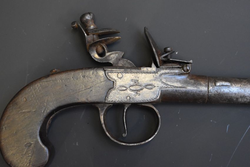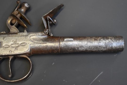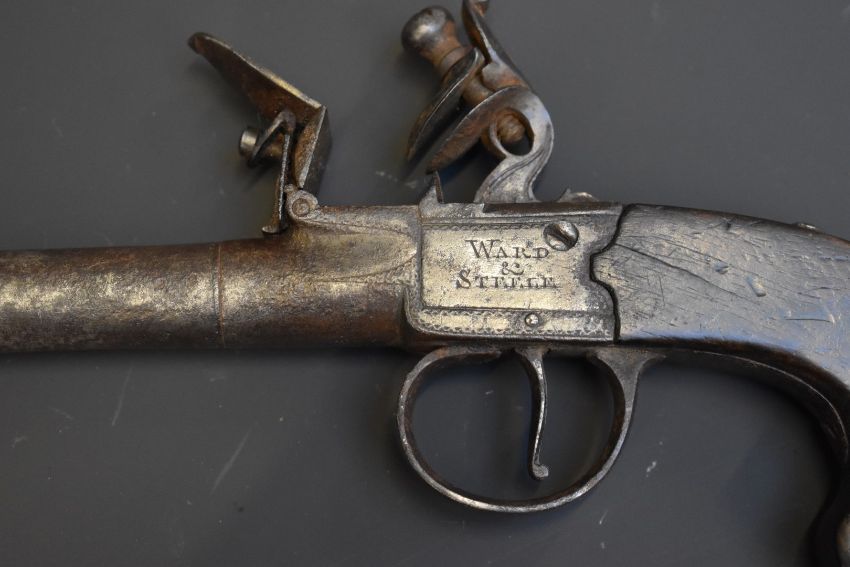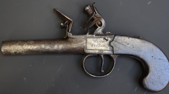 Ward & Steele flintlock pocket pistol with named and engraved lock, engraved trigger guard, shaped wooden grip and 2.5 inch turn off barrel, overall length 19cm.