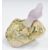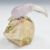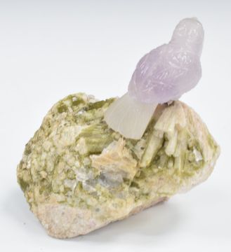 A quartz toucan with clear bill and pink body, with cabochon red stone eyes and silver claws gripping a tourmaline crystal rock, 9cm