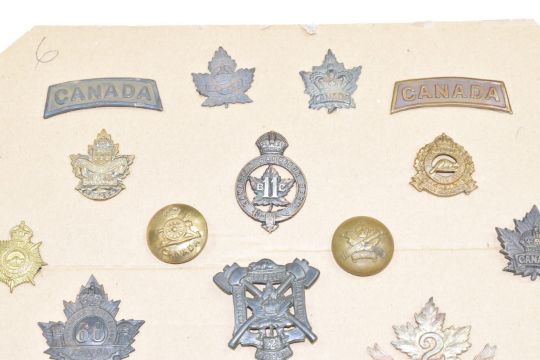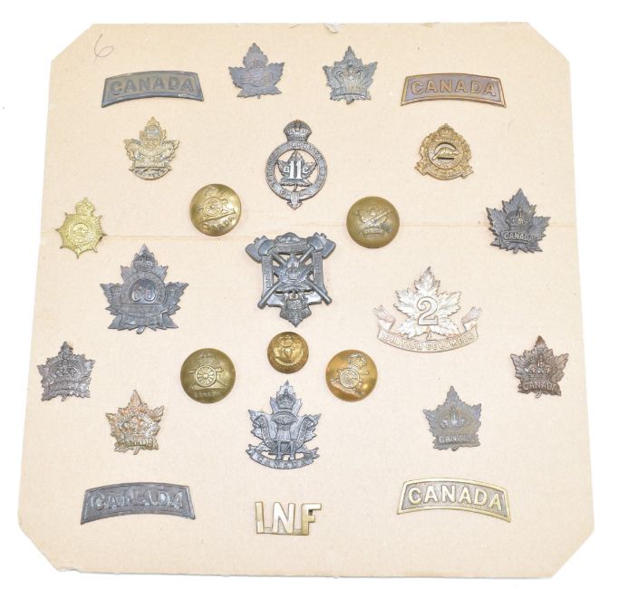 A carded display of approximately twenty five WW1 Canadian Army insignia including artillery buttons