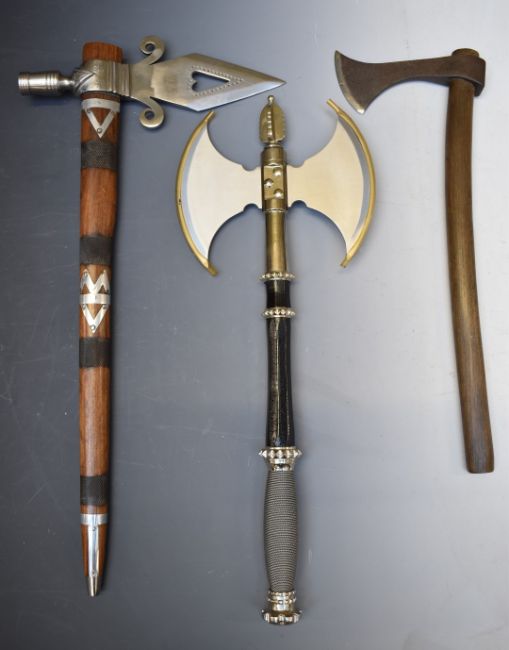 Three replica weapons including North American Frontier axe, Magnum double headed axe and a Viking battle axe, largest with 62cm handle and 32cm blade. PLEASE NOTE ALL BLADED ITEMS ARE SUBJECT TO OVER 18 CHECK ON COLLECTION OR DELIVERY