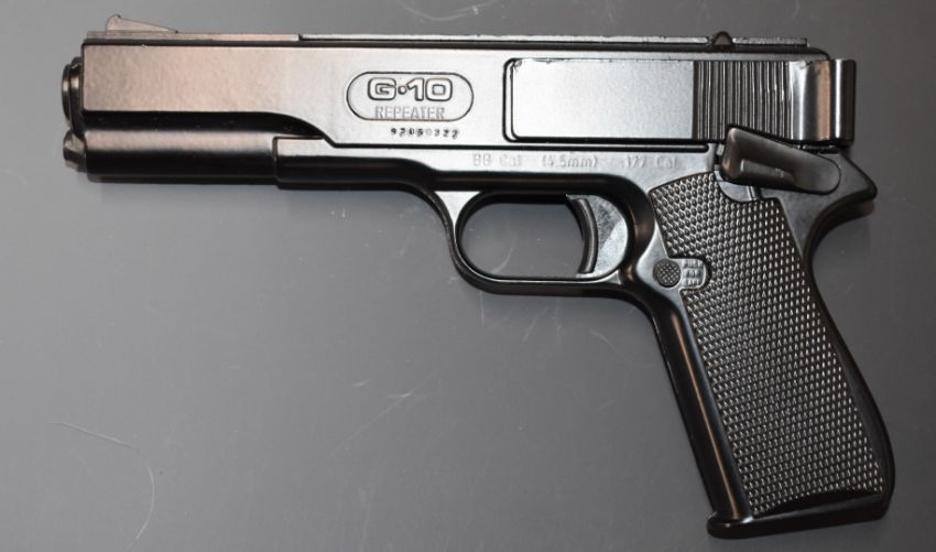 Sportsmarketing G10 .177 18 shot repeater air pistol, serial number 92050322, in original box with instructions and targets.