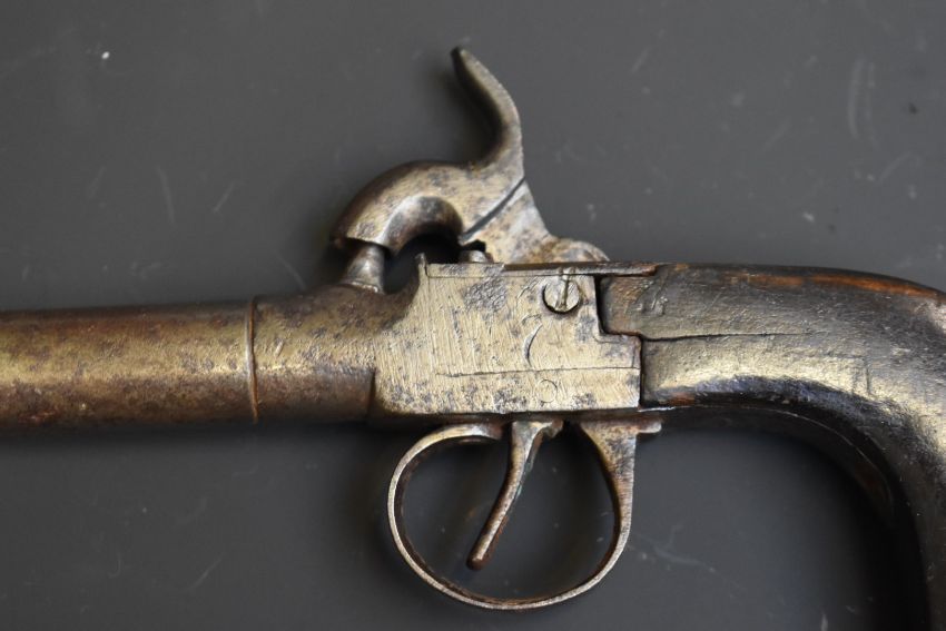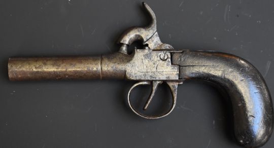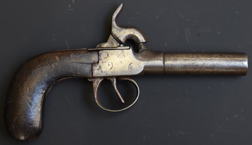 Unnamed percussion hammer action pocket pistol with shaped wooden grip and 2.25 inch smooth bored turn off barrel, overall length 17cm.