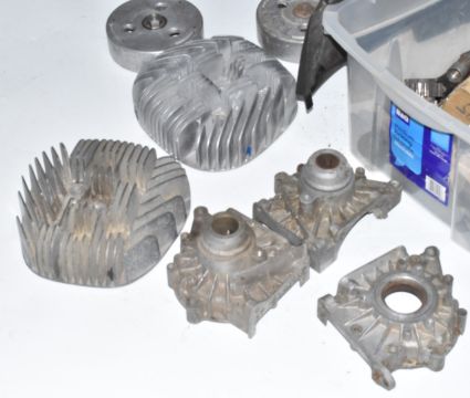Villiers Starmaker motorbike engine parts, to include three crankcase halves, flywheels, two cylinder heads, gears etc