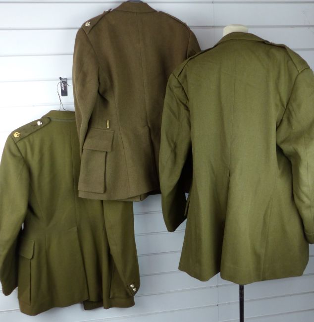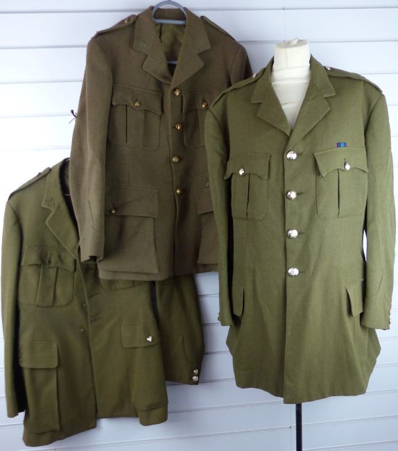 Three British Army Royal Gloucestershire Hussars officer's No 2 dress khaki tunics with medal ribbon and regimental buttons. Consigned for sale by the Trustees of the Royal Gloucestershire Hussars Trust