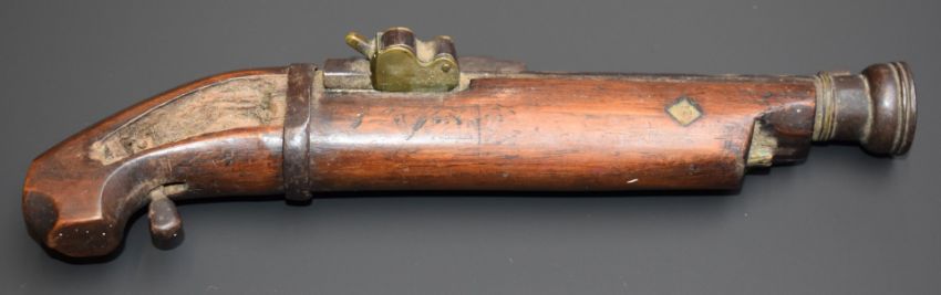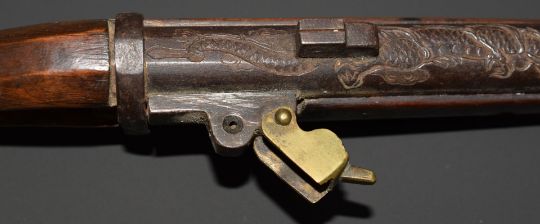 Japanese matchlock pistol with engraved decoration of a dragon with gilt eyes to the 5.5 inch smooth bored barrel and flared muzzle, overall length 21cm.