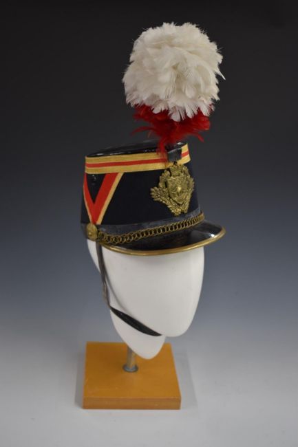 French Parisian fireman's parade hat with brass badge, white over red plume, chin strap and liner
