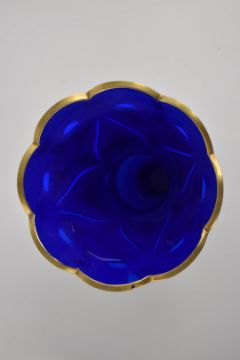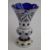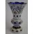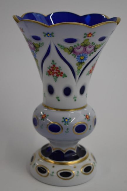 19thC overlaid and cut glass vase with white casing over blue ground, hand decorated with flowers and gilt banding, 21.5cm tall.