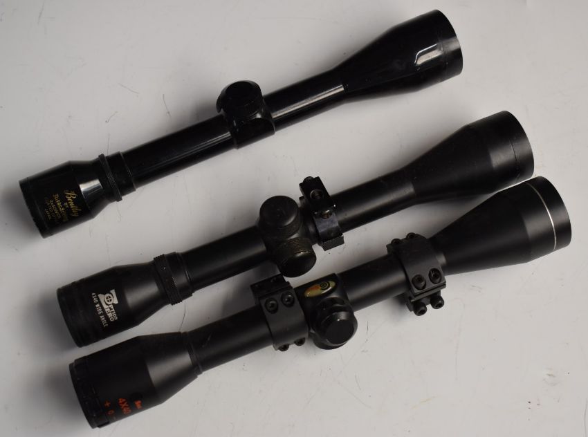 Three 4x40 rifle scopes Nikko Sterling Bentley, SMK and Zero Option Wide Angle, two with scope mounts.