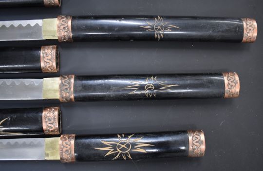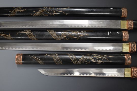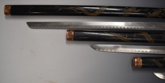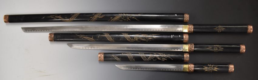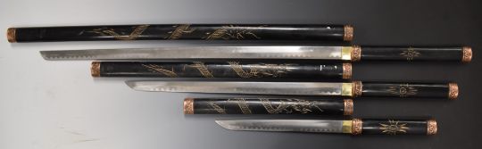 Graduated set of three replica Samurai swords, longest blade 66cm. PLEASE NOTE ALL BLADED ITEMS ARE SUBJECT TO OVER 18 CHECK ON COLLECTION OR DELIVERY