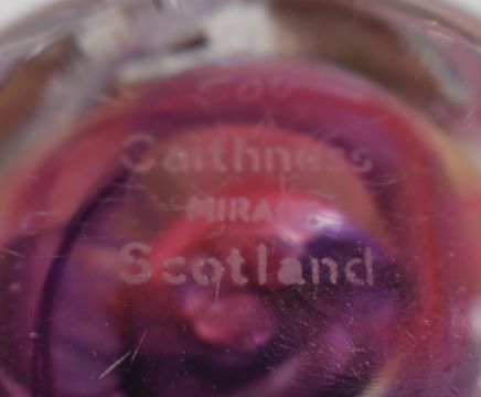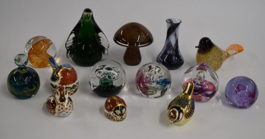 Thirteen Royal Crown Derby, Caithness, Mdina, Wedgwood and similar glass and ceramic paperweights together with a Caithness vase.