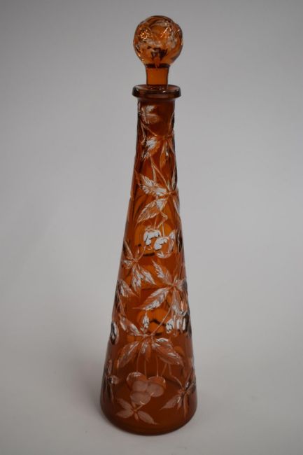 Stevens and Williams early 20thC copper orange overlay intaglio cut decanter, attributed to Joshua Hodgetts, the tapering cylindrical body leading to a cut spherical stopper, both decorated with images of fruit among the leaves, 38cm tall.
