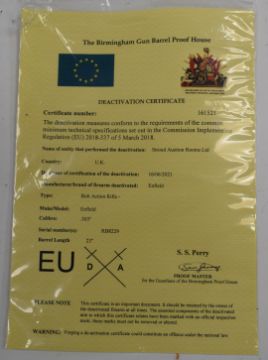 Deactivated BSA Lee-Enfield LEC .303 bolt-action cavalry carbine rifle with frame stamped 'Enfield 1893 II' and with crown over VR cypher, brass plate inset in the stock stamped '24', adjustable ladder sights, sling suspension loop, brass butt plate and 23 inch barrel, overall length 107cm, serial number RB8229, with deactivation certificate dated 16/06/21.
