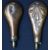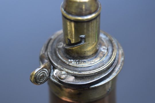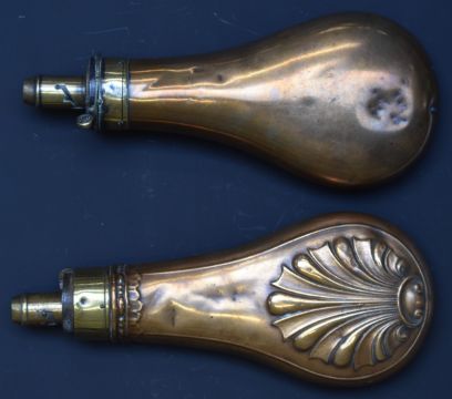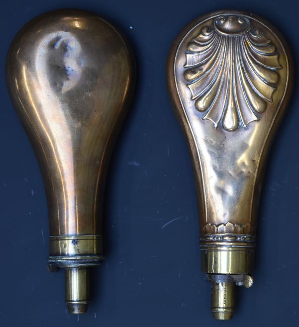 Two G & J W Hawksley copper and brass powder flasks, one with embossed decoration, largest 20cm long.