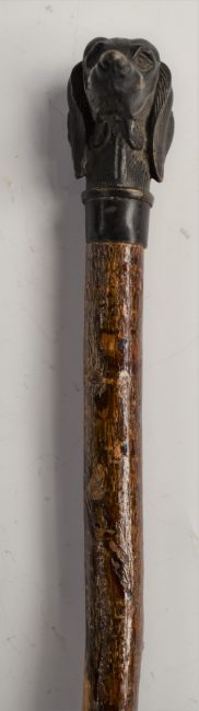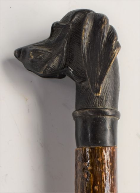 A vintage walking stick with bronze dog head handle
