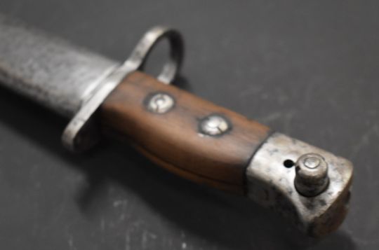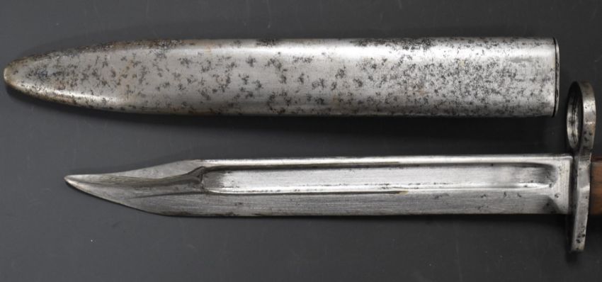 British knife bayonet with wooden grips, 20cm 'Bowie' fullered blade and scabbard. PLEASE NOTE ALL BLADED ITEMS ARE SUBJECT TO OVER 18 CHECK ON COLLECTION OR DELIVERY