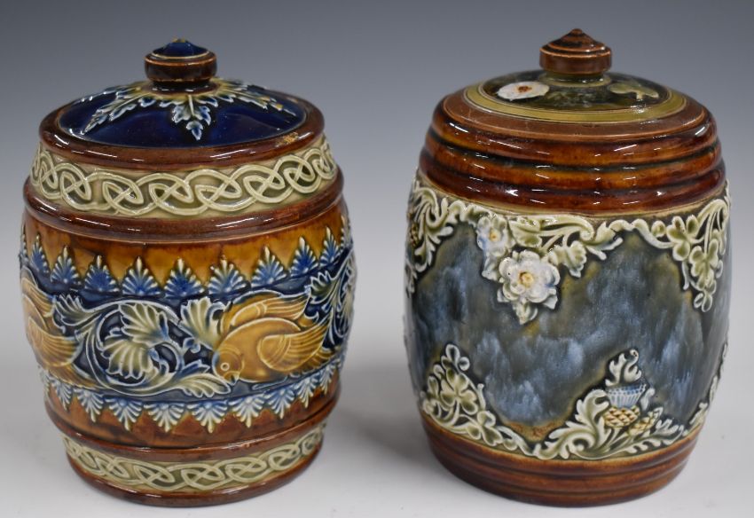Two Doulton Lambeth covered tobacco jars, H14cm