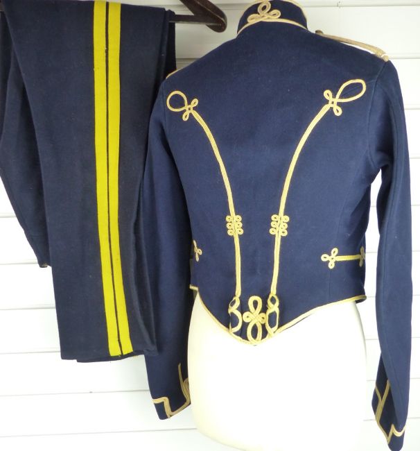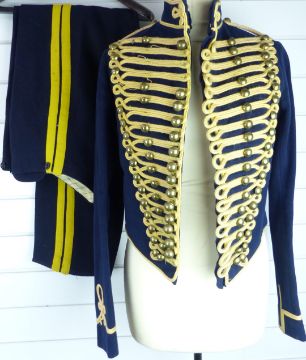 British Army Royal Gloucestershire Hussars other ranks full dress jacket of blue cloth, with eighteen loops of yellow mohair cord to front and six rows of brass half/ full domed buttons, the lining of black cotton, H Lehmann, Aldershot tailor's label to collar, together with a pair of overalls. Consigned for sale by the Trustees of the Royal Gloucestershire Hussars Trust