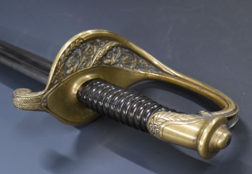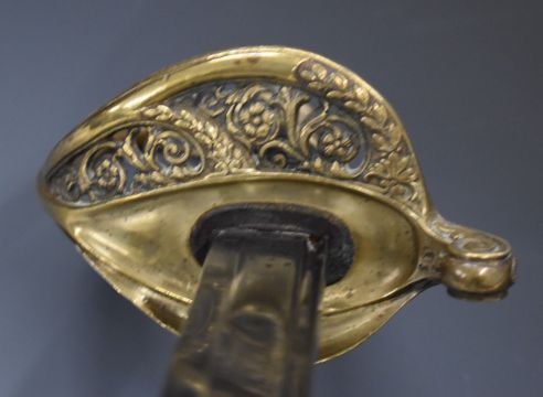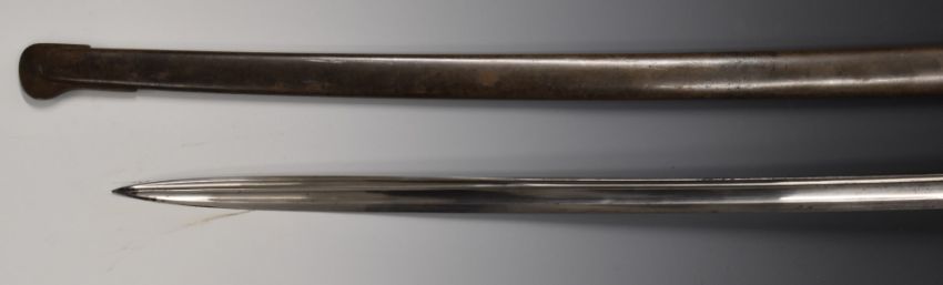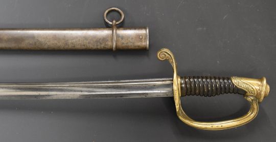 French 1845 pattern sword with brass hilt, stamped 17999 and R.B.G to guard, with 77cm fullered curved blade and scabbard. PLEASE NOTE ALL BLADED ITEMS ARE SUBJECT TO OVER 18 CHECK ON COLLECTION OR DELIVERY