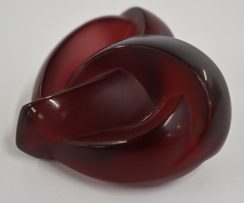 Lalique Coeurs Entrelaces red frosted glass paperweight signed Lalique France to the base, 73x67mm.