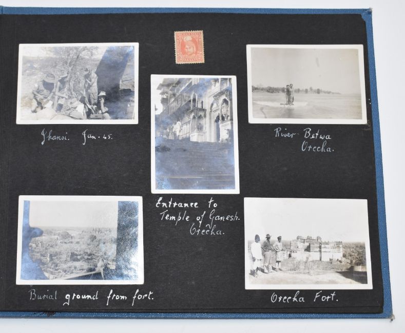WW2 photo album containing approximately 90 photographs attributed to Chindit Sgt W B Wilkinson Royal Engineers, India - Burma 1943-1946 featuring military, civilian, social and miscellaneous scenes, including 'Y' Tank near Bangalore, village and bazaar scenes, native tradesmen, bullock carts, camel transport and Taj Mahal, the majority captioned, together with contemporary banknotes, one signed by Vera Lynn etc