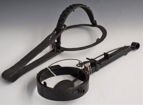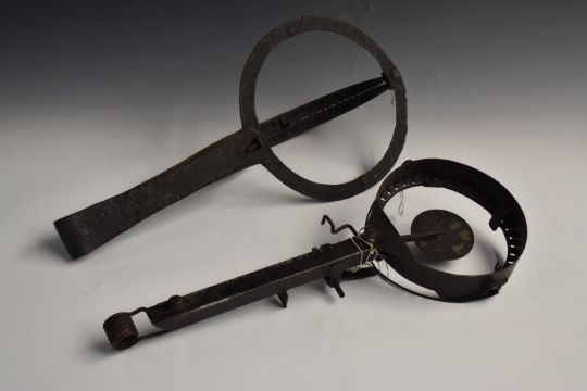 Two vintage large steel and wrought iron animal traps with circular ends, largest 53x25x18cm.