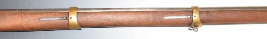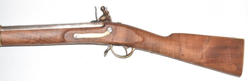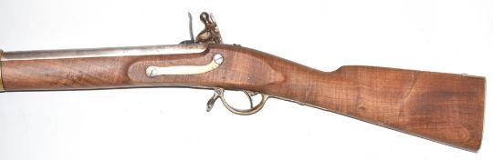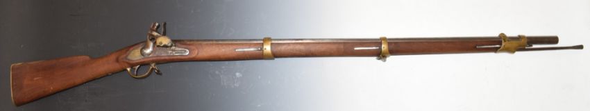 Prussian Polsdam pattern .75 flintlock hammer action gun with 'Polsdam GS' stamped to the lock, brass trigger guard, butt plate and mounts, steel ram-rod, sling suspension loops and 41 inch smooth bored barrel, overall length 151cm, serial number 2175. PLEASE NOTE THAT A VALID RELEVANT FIREARMS/SHOTGUN CERTIFICATE IS REQUIRED TO HANDLE/PURCHASE THIS ITEM.