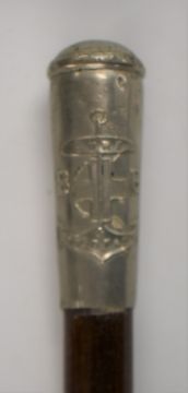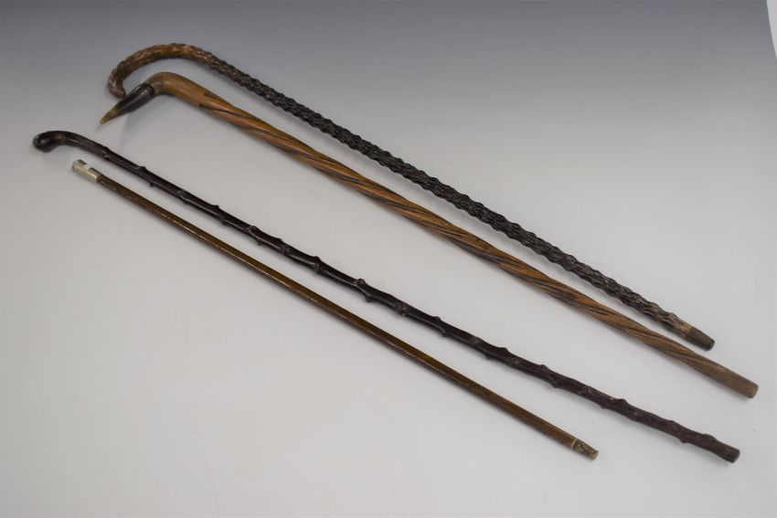Walking stick, the spiral shaft with horn handle, the neck engraved F Cowdrey, Made by Prisoner of War St Helena 1902, together with three other sticks