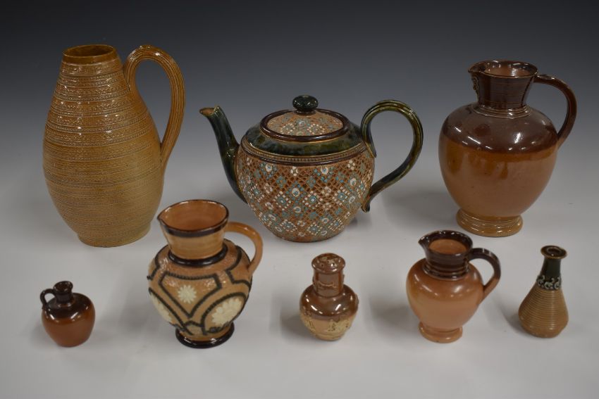 Doulton Slaters patent teapot, mask jug with flower decoration, miniatures etc, tallest 20cm