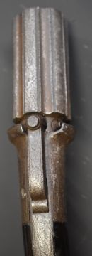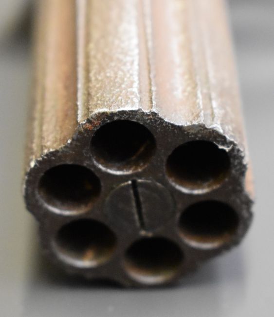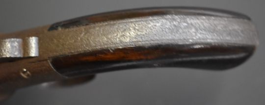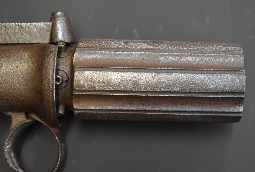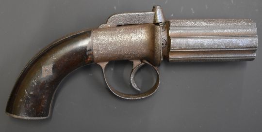 Unnamed six-shot bar hammer action pepperbox revolver with shaped wooden grips and 3 inch barrels, overall length 21cm.