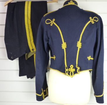 British Army Royal Gloucestershire Hussars other ranks full dress jacket of blue cloth, with eighteen loops of yellow mohair cord to front and six rows of brass half/ full domed buttons, the lining of black cotton, named Wakeley to pocket, together with a pair of overalls. Consigned for sale by the Trustees of the Royal Gloucestershire Hussars Trust