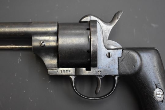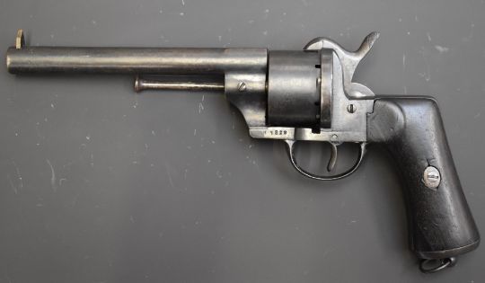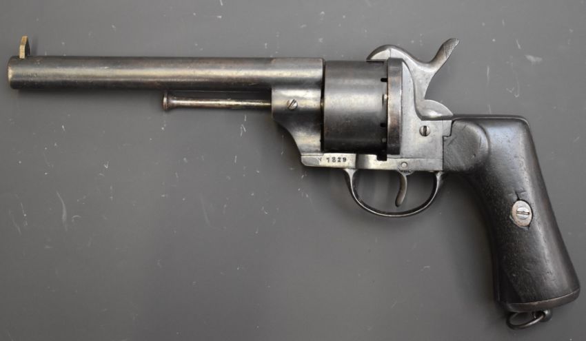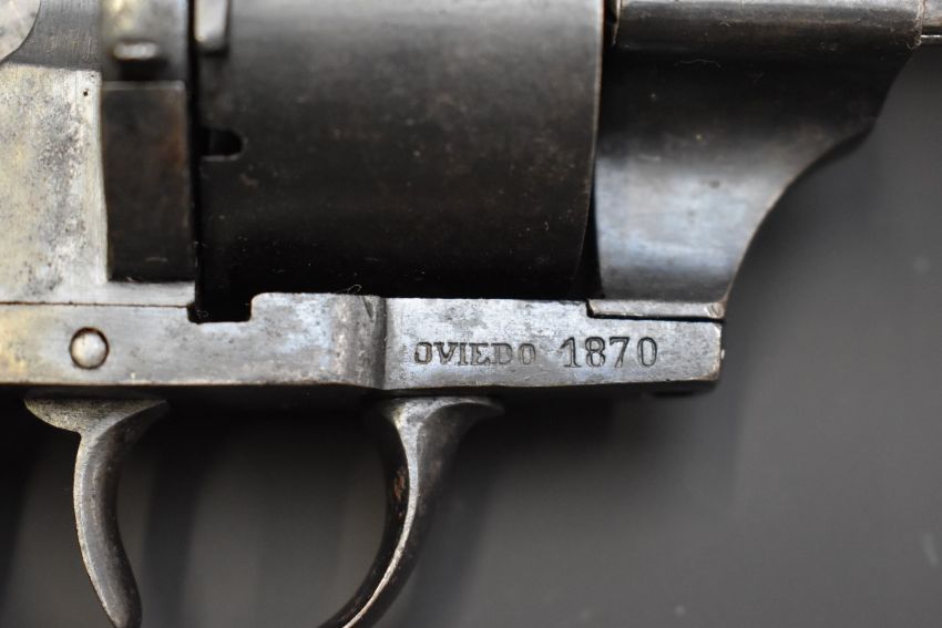 Spanish 11mm six-shot single-action pin-fire revolver with frame stamped 'Oviedo 1870' shaped wooden grips, belt loop and 6 inch barrel, overall length 30cm.