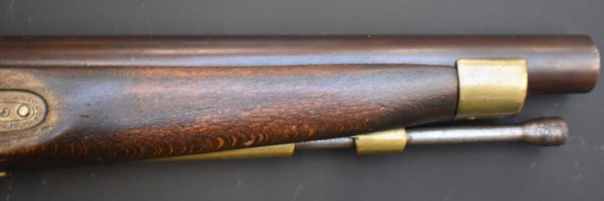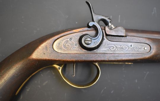 Unnamed percussion hammer action pistol with engraved locks and hammer, brass trigger guard, butt plate and mounts, steel ram-rod and 8.5 inch barrel, overall length 40cm, serial number 1857/020617. PLEASE NOTE THAT A VALID RELEVANT FIREARMS/SHOTGUN CERTIFICATE IS REQUIRED TO HANDLE/PURCHASE THIS ITEM.