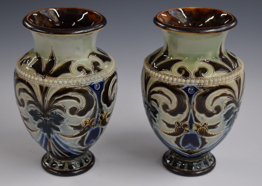 Pair of Royal Doulton pedestal vases decorated with flowers, foliage and beadwork, monogrammed for Emily Stormer, H14cm