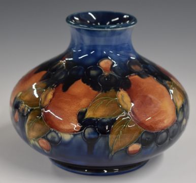 Moorcroft signed squat pedestal vase decorated in the Pomegranate pattern, with impressed 'Maker to HM The Queen' to base, H14, diameter 15cm