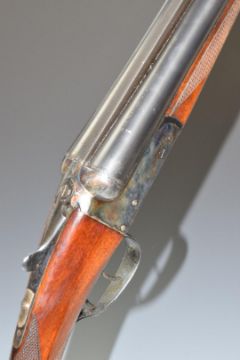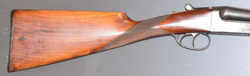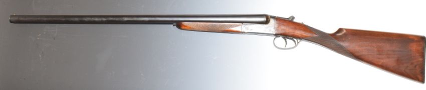 AYA Yeoman 12 bore side by side shotgun with chequered grip and forend, double trigger and named 28 inch barrels choked ½ and full, overall length 114.5cm, length of pull 37.5cm, serial number 538879. PLEASE NOTE THAT A VALID RELEVANT FIREARMS/SHOTGUN CERTIFICATE IS REQUIRED TO HANDLE/PURCHASE THIS ITEM.