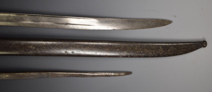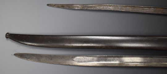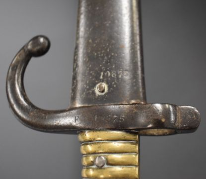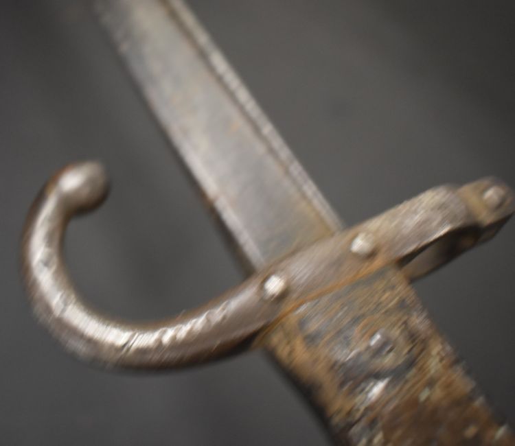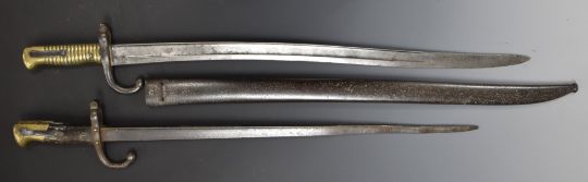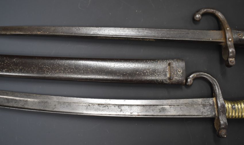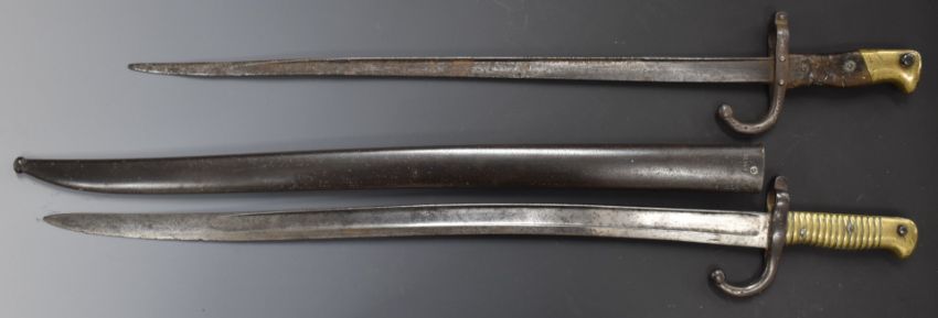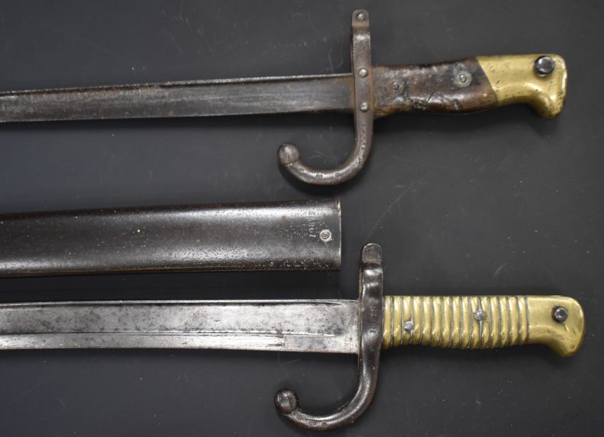 Two French bayonets comprising an 1874 Gras example with T form 51cm blade and an 1866 Chassepot with 57cm Yataghan blade and scabbard and matching serial numbers 70875. PLEASE NOTE ALL BLADED ITEMS ARE SUBJECT TO OVER 18 CHECK ON COLLECTION OR DELIVERY
