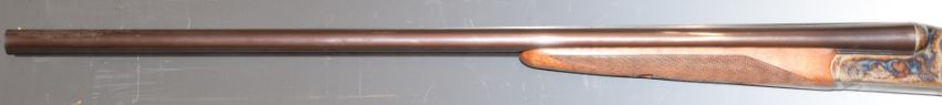 Webley & Scott 20 bore side by side ejector shotgun with engraved and case hardened locks, underside, trigger guard, fences, top plate and thumb lever, chequered semi-pistol grip and forend, single trigger and 28 inch barrels, overall length 116cm, length of pull 37.5cm, serial number TRJ0105. PLEASE NOTE THAT A VALID RELEVANT FIREARMS/SHOTGUN CERTIFICATE IS REQUIRED TO HANDLE/PURCHASE THIS ITEM.