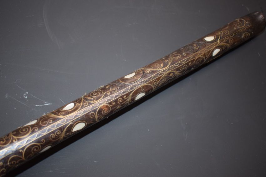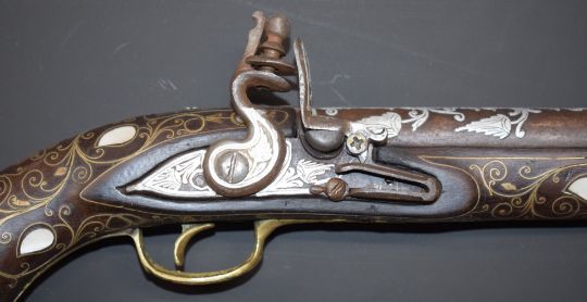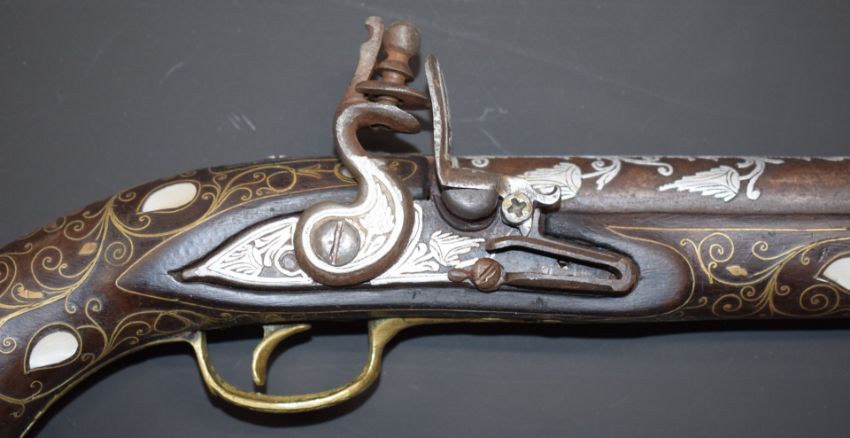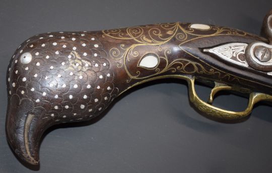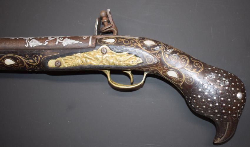 Eastern large flintlock pistol with butt carved in the form of a bird, with frame inlaid all over with brass wire and mother of pearl, engraved brass trigger guard, and white metal decorated lock, frizzen and 18 inch smooth bored barrel, overall length 65cm.