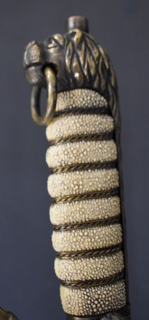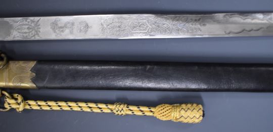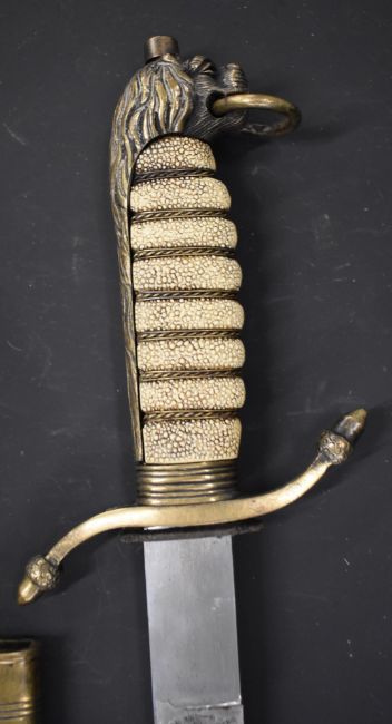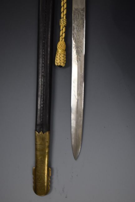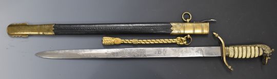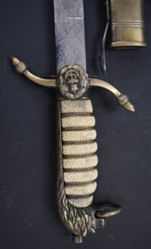 Royal Navy midshipman's dirk with brass cross piece, fouled anchor cypher, lion head pommel, 47cm etched blade, scabbard and frog. PLEASE NOTE ALL BLADED ITEMS ARE SUBJECT TO OVER 18 CHECK ON COLLECTION OR DELIVERY